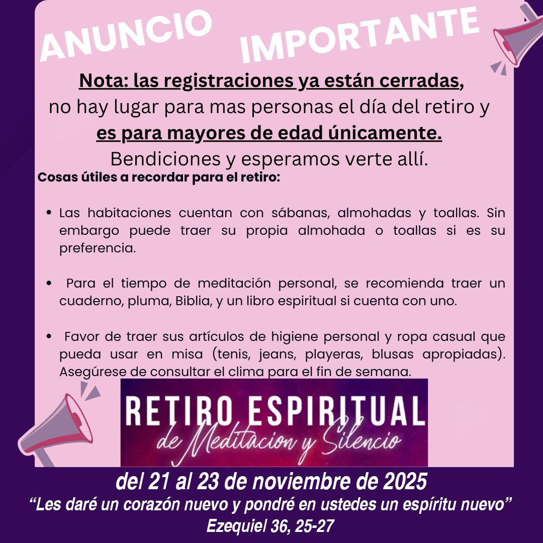 Nota: las registraciones ya están cerradas, no hay lugar para más personas el día del retiro y es para mayores de edad únicamente. Bendiciones